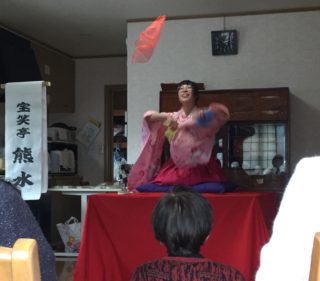 これだけ笑うお客様にお会いしたことがないほどの大爆笑落語会となりました。その後はお茶会に参加させて頂き、明るく楽しい皆さんとお喋りしながら、理事長さん差し入れのリンゴとシルバーベル、小豆から煮込んだおしるこ、喜んぶで昆布煮の手料理を美味しくいただきました。「私80歳」「私70歳」と教えてくださったのですが、皆さん本当にお若いんです!笑いは健康、元気の秘訣なんだと改めて実感して参りました。有難いことにぜひまた来年も来て欲しいと1年後のご予約も頂き、果物のお土産も頂戴しまして帰路についた私たちでございます。