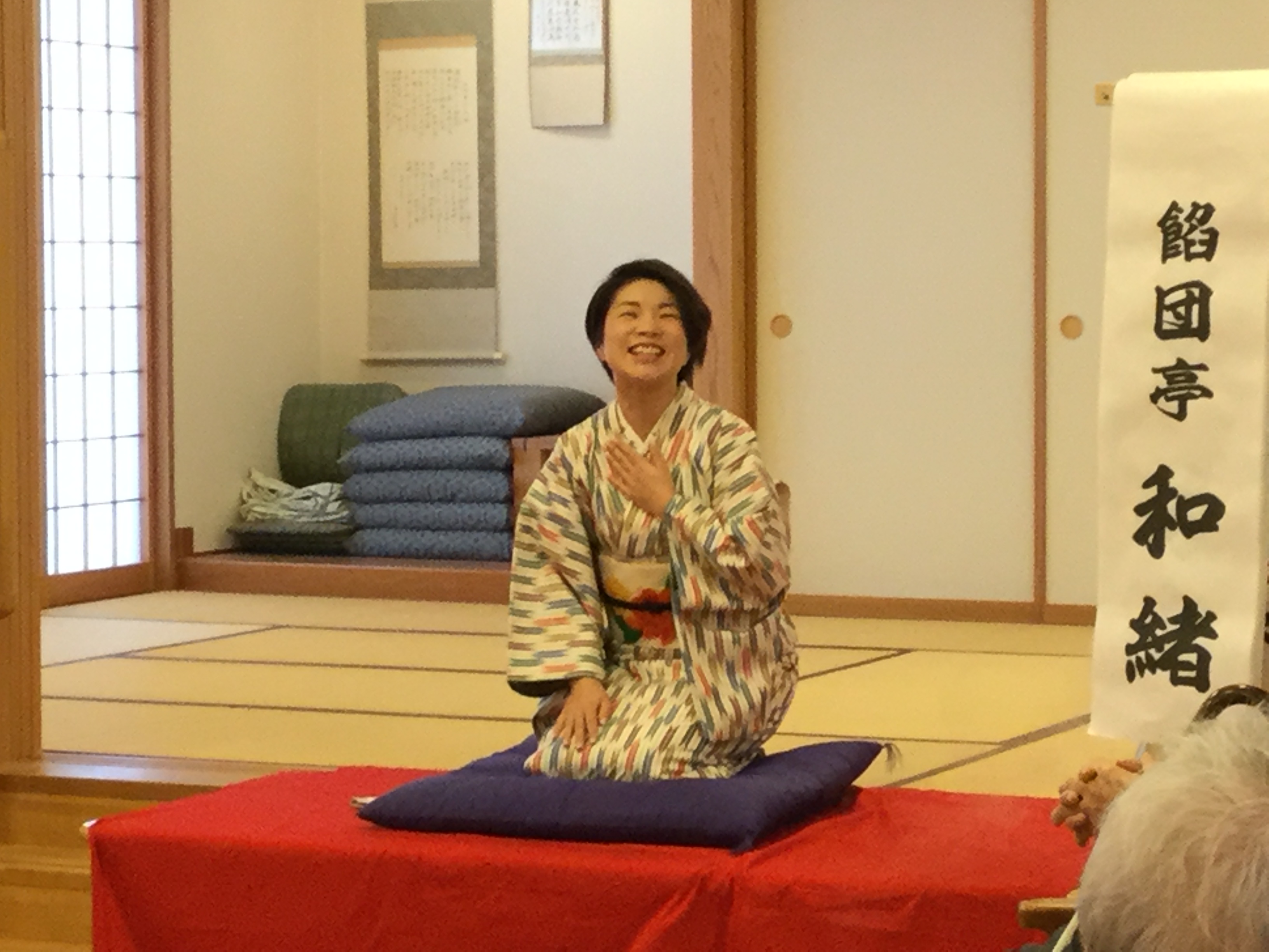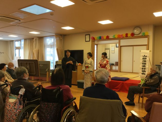 本日は、ニチイケアセンター山形五十鈴さんに、笑風亭間助代表、餡団亭和緒さん、宝笑亭熊水の3人でお邪魔してきました。今回は5回目のご依頼となりまして、誠にありがとうございます。たいへん反応の良い約20人のおじいちゃん、おばあちゃんに笑いを届けて参りました♪