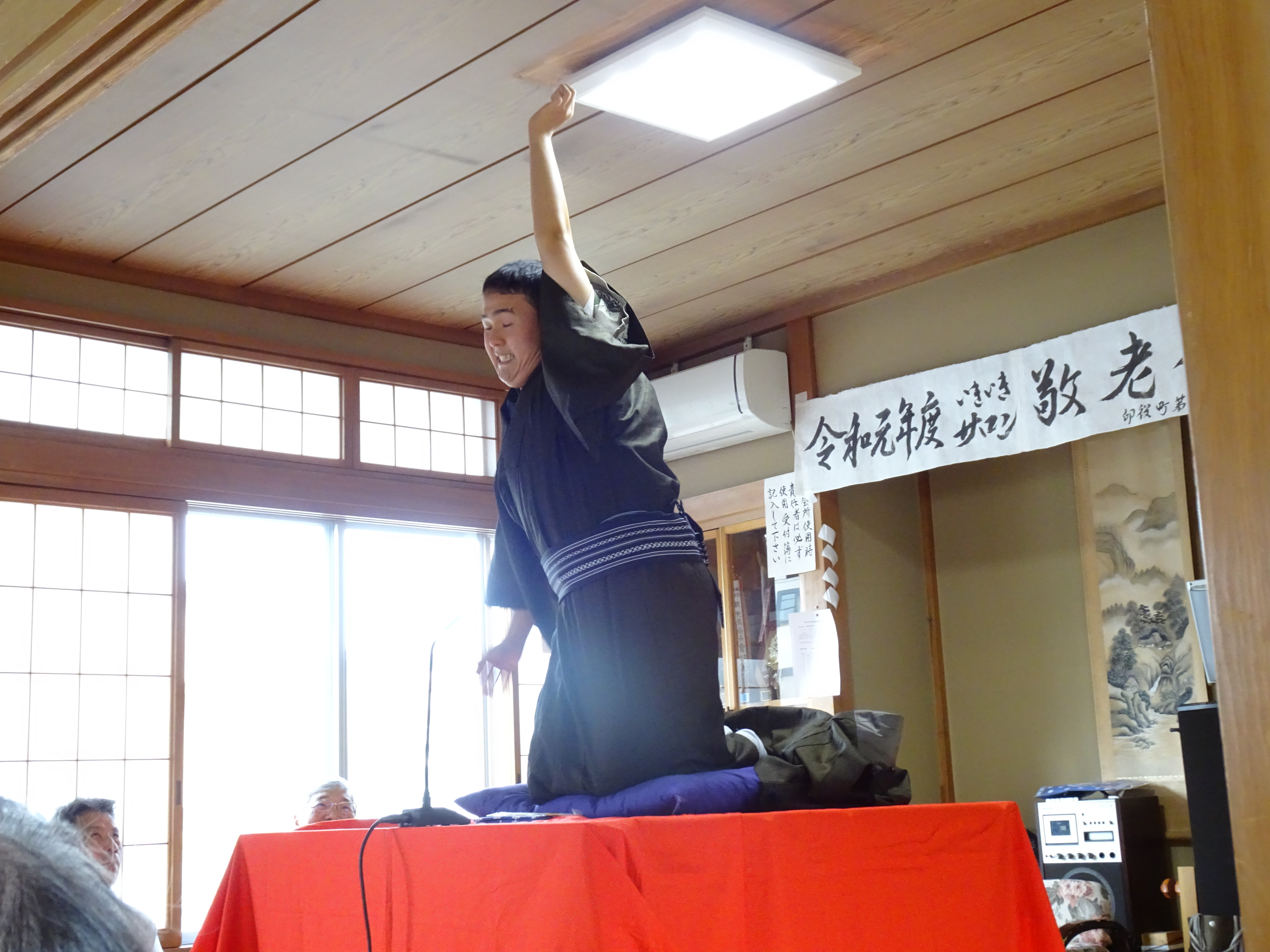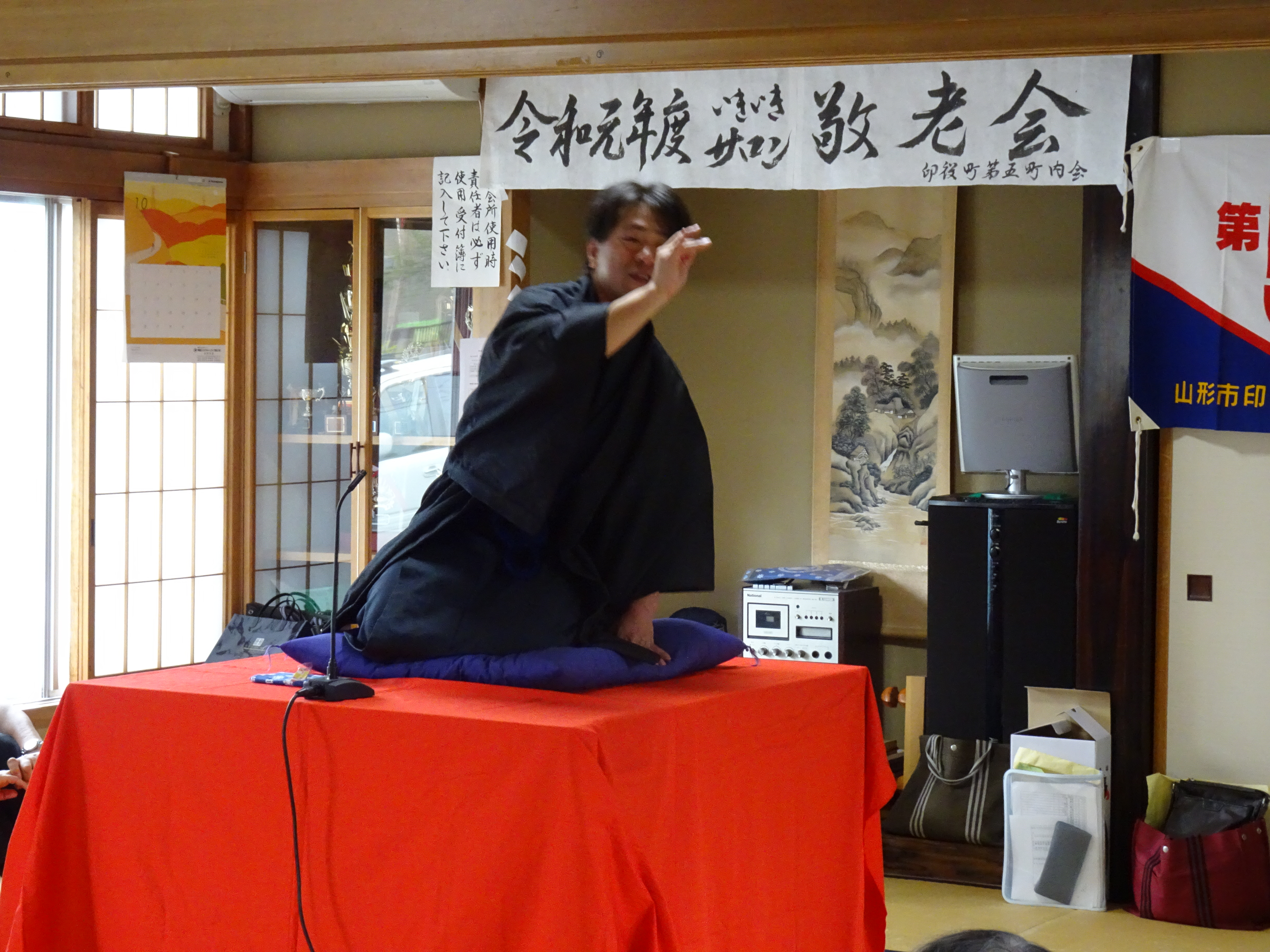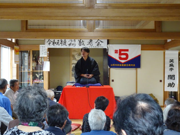 今日は、印役町第五町内会の敬老会におじゃましました。わたくし間助と丘割くんの地元ということもあり、今年で3回目のおめでたい落語会となります。