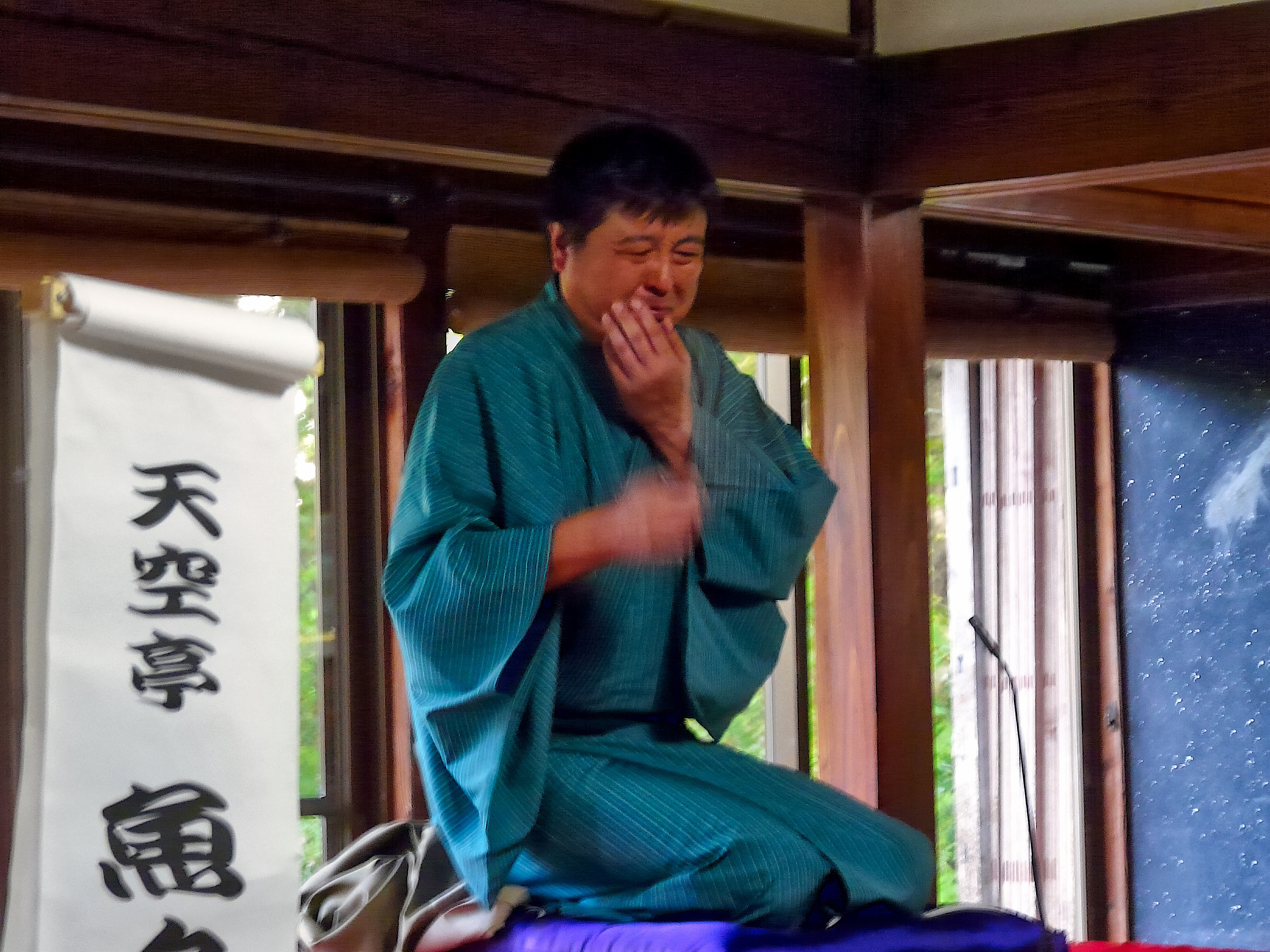 膝替わりは、如月家道楽さんの「金色夜叉」です。カツラをかぶって登場という奇抜な演出に皆さん大喜び。かなりマニアックな内容ですが、道楽さんがアドリブに近い形で入れ込むくすぐりに皆さん大笑い。道楽さんのフラ(全身から醸し出すオーラみたいなもの)が生きた一席でした。( ^)o(^ )