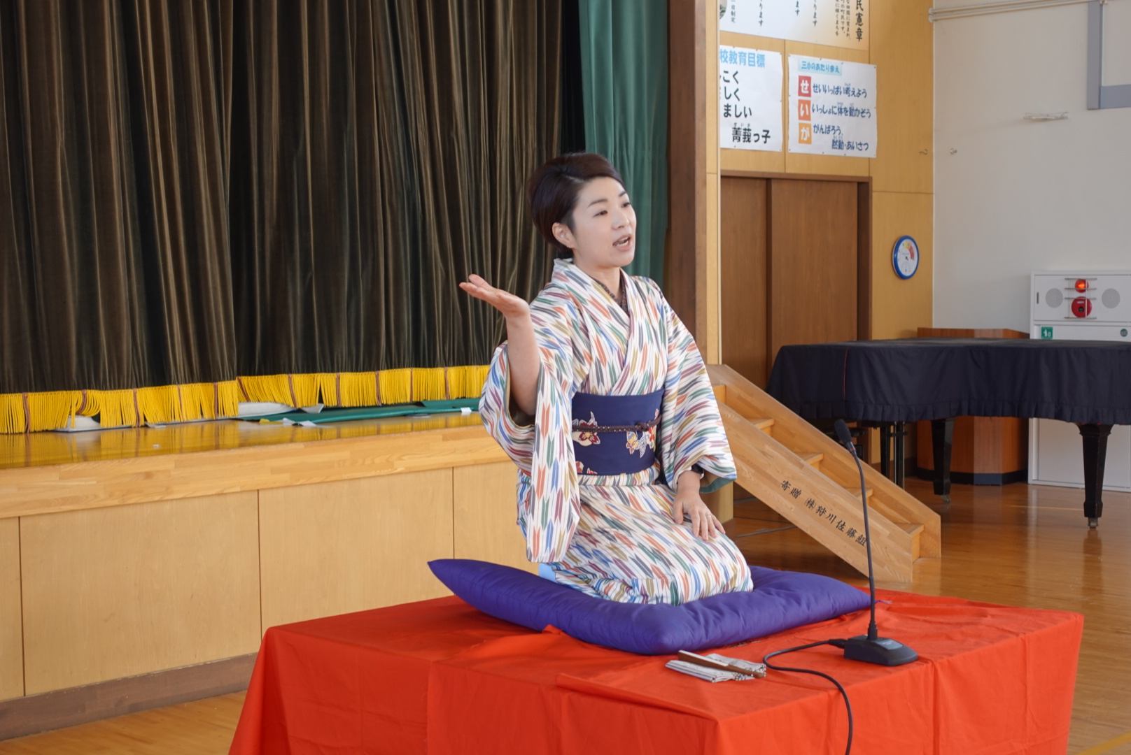 わたくし間助から、4年生の国語の教科書に載っている内容の説明を中心に落語の歴史や特徴、道具や演じ方など、ゆっくり丁寧に説明させていただきました(*^_^*) 児童のみなさんもすっかり落語の見方を理解してくれたようで、小噺「ゆみこ」から本編まで大いに笑って学んでいただけたと思います(*^_^*)v