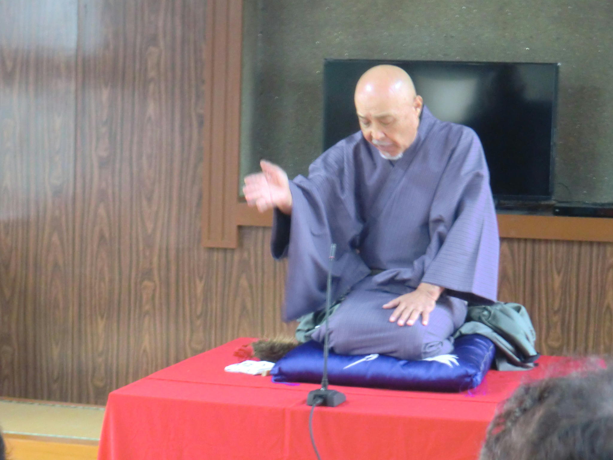 10月28日(水)、山形市の鮨洗公民館で開かれた、「鮨洗町内会落語会」に如月家道楽さんと私、山彦亭虎之輔の二人がお邪魔してきました。同町内からの山形落語愛好協会への依頼は今回が初めてということで、張り切って参上した次第です。「百歳体操」を終えたばかりの明るい表情の約15名の皆様に、最初のあいさつで「体操は体にいいし、落語は想像力を使うので、頭の体操としていいですよ。皆さん元気だから、落語を聞けば鬼に金棒です。」と前口上を述べた後、落語三席をお楽しみいただきましたよ(^^)