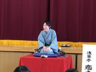 授業は生徒の皆さんの元気な挨拶からスタート。落語をテレビなどで見たことのある生徒さんがほとんどでしたが、まずは落語のなりたち、所作や道具についてを説明した後、小噺を2本お聞きいただきました。小噺では落ちのタイミングで拍手をする練習をしましたが、皆さんからバッチリなタイミングで大きな拍手を頂きましたよ(*^_^*)