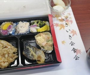 終演後のいきいき会食会には、我々噺家二人もお相伴し、山菜おこわや柿のくるみ和え、蕨の煮物、さばの味噌煮等々、東地区食生活改善推進協議会の皆さんが塩分を控えめに作ってくれたごちそうに、舌鼓を打ちました。今回のお客さまは、東地区会長会や東地区民生児童委員協議会の皆さん等、役員の方がほとんどでしたが、「一般の方にも聞かせたい」という声も聞かれました。