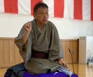 今回は出演者が一人なので、「最初のあいさつ」なしで、虎之輔が高座にあがりました。マクラでは、自身が上山市の観光ボランティアも務めている話題から、お客様参加型の「寅さんのタンカバイ」に進みました。噺家がオチを言う矢先に、お客さんにオチを敢えて答えてもらい、答えが出ると私がジェスチャーでリアクションを返す流れなのですが……。前の方におられた男性方が積極的に答えてくれ、会場は大いに盛り上がりましたよ。その勢いで、第二次世界大戦中はなぜか「禁演落語」になった本日の演目の『六尺棒』へ突入しました。商売熱心で、頑固一徹な父親と、夜遊び・火遊び・遊び放題の道楽息子のああ言えばこう言う、丁々発止のやり取りに、会場はおおいに盛り上がり、無事、本日のお開きを迎えました。( ^)o(^ )