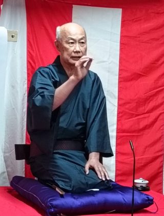 続いては、道楽さんの登場です。演目は、九月中旬になっても連日30度を超える今の時節にぴったりの『怪談 耳なし芳一』ですが、今回は小噺で大いに沸かせる前半と、おどろおどろしい講談を抑揚たっぷりに聞かせる後半という、落語と講談の二部構成を取っていましたね。後半のクライマックス、芳一が耳を平家の落ち武者に引きちぎられる鬼気迫る場面では、お客様も鳥肌が立つ恐怖を味わったのではないでしょうか。九百年以上も前の世界にタイムスリップしていたお客様が、「小泉八雲作の『怪談 耳なし芳一』これにて読み終わります」の締めの言葉で、現実に引き戻されたところで、お後と交代です( ^)o(^ )