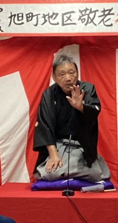 敬老の日の9月16日(月)、上山市の旭町の旭町公民館で開かれた「のんき・元気・やる気!旭町地区敬老祝賀会」にお呼ばれし、山形落語愛好協会の下記の三名がお邪魔して来ました。午前10時に始まった同会では、地区会長のあいさつの後、来賓の上山市長・上山市議(旭町在住)のあいさつがあり、その後めでたく百寿、卒寿、米寿、傘寿、喜寿を迎えられた方々の表彰式がありました。そして、落語の部は10時15分にスタート。約35名の元気はつらつとした皆様に、当会の落語三席でたっぷりと楽しんでいただきましたよ!!(^^)!