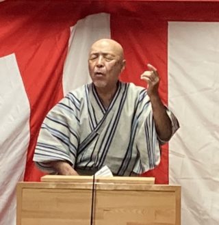 しょっぱなは稲穂さんです。開口一番、「今日が、デビューの高座です」と自己申告すると、お客様からあったかーい拍手をいただきましたよ。そして、筆者も知らなかった「昨年、大病を患って生死の境をさまよい、闘病生活を余儀なくされた」と衝撃の告白を始めるも、「三途の川が洪水で渡れず、この世にもどされました」とオトスところ等、新人とは思えない「これぞ落語」という話しぶりでしたよ。大病を克服し、古稀のアマチュア噺家としてスタートした稲穂さんの初演目は、最も有名な噺の一つで、国語の教科書にも登場する『寿限無』。この噺の聞かせどころである「言い立て」も無事クリアし、お客様をしっかり引き付けて、お後と交代です(^_-)-☆