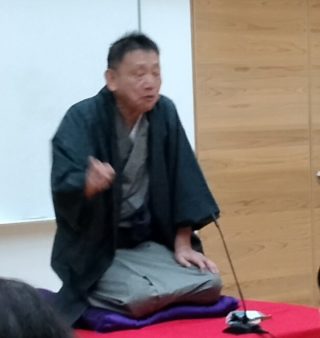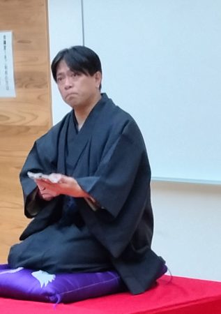 続いては、虎之輔が務めさせてもらいました。先ずは「私も本日のお客様方と同じく、退職公務員です」と自己紹介。その後、最近亡くなった俳優の西田敏行さんの代表作『釣りバカ日誌』の話題から、同時期に上映されていた渥美清の『男はつらいよ』につなげ、お客様参加型の「寅さんのタンカバイフルバージョン」をかけました。特に男性のお客様がしっかりオチを答えてくれ、会場は盛り上がりましたよ。その勢いで、演目の『六尺棒』に突入。頑固親父と放蕩息子の丁々発止の親子喧嘩に、ここでも寅さんのタンカバイを織り込み、会場はさらに盛り上がってお後と交代です(^O^)