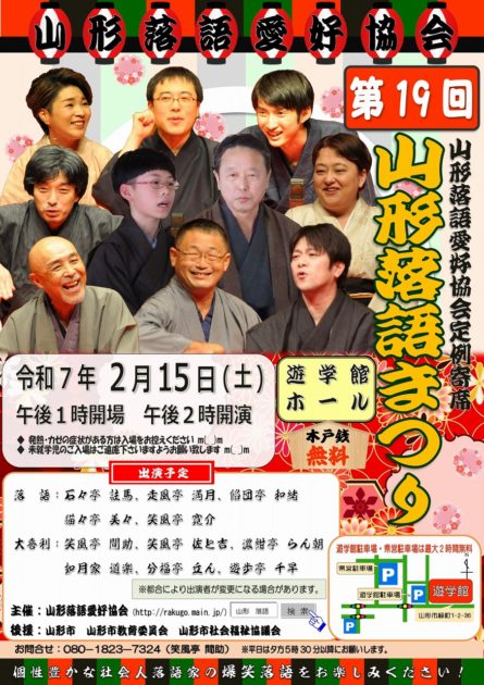第19回山形落語まつりのご案内 投稿日:2025年1月12日 作成者: yamagata-rakugo2月 17, 2025 いつも当会の活動に応援いただきありがとうございますm(_ _)m さて、このたびも皆様からのご声援を受け「第19回山形落語まつり」を開催する運びとなりました。 今回は、大喜利もやっちゃいます(*^^)v メンバー一同、みなさまに笑っていただき、寒さを笑いで吹き飛ばせるよう頑張ってまいりますので、寒さ厳しい時期ではありますが、ぜひともご来場のほどよろしくお願いいたします。 お知り合いなどにもお声がけいただければ幸いです。 山形落語愛好協会 代表 笑風亭佐と吉 ↓画像をクリックすると拡大します