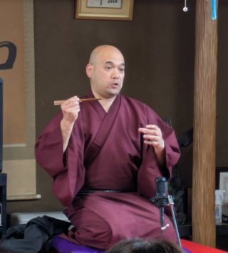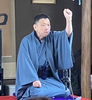続いては、当協会の副代表及び照明担当を兼任する満月さんです。演目は、清というそば好きの大食い男が登場する『そば清』。この男の生業は、なんと「かけそば」ならぬ「賭けそば」で、通称「そば清」と呼ばれています。町内の若い衆相手にそばの大食いで荒稼ぎする「そば清」に、せいろ50枚で1両の勝負が持ち込まれ、さすがの「そば清」も二の足を踏むのですが……はてさて。満月さんの次第に早くそばを手繰る仕草の熱演にお客様もしっかり見入っていましたよ(^_-)-☆会場をさらに温めて、お後と交代です。