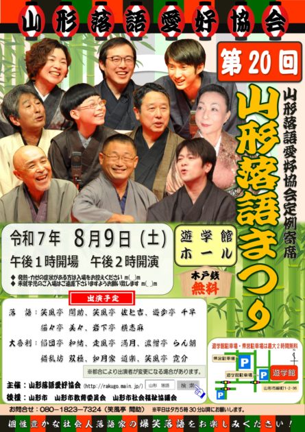 第20回山形落語まつりのご案内 投稿日:2025年6月21日 作成者: yamagata-rakugo8月 28, 2025 いつも当会の活動にご声援・応援いただきありがとうございますm(_ _)m さて、このたびも皆様からのご声援を受け「第20回山形落語まつり」を開催する運びとなりました。 今回も、前回大好評だった大喜利をやっちゃいますよ(*^^)v メンバー一同、夏の暑さを吹き飛ばす笑いを、みなさまにお届けできるよう頑張ってまいりますので、暑さ厳しい時期ではありますが、ぜひともご来場のほどよろしくお願いいたします。 お知り合いなどにもお声がけいただければ幸いです。 山形落語愛好協会 代表 笑風亭佐と吉 ↓画像をクリックすると拡大します