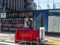 今日は、七日町大通りを歩行者天国として「山形市のお宝マルシェ2011」というイベントが開催されました。たくさんの出店が立ち並ぶ大きなイベントですが、当会は、大沼デパート前交差点の特設ステージで落語披露させていただきました。