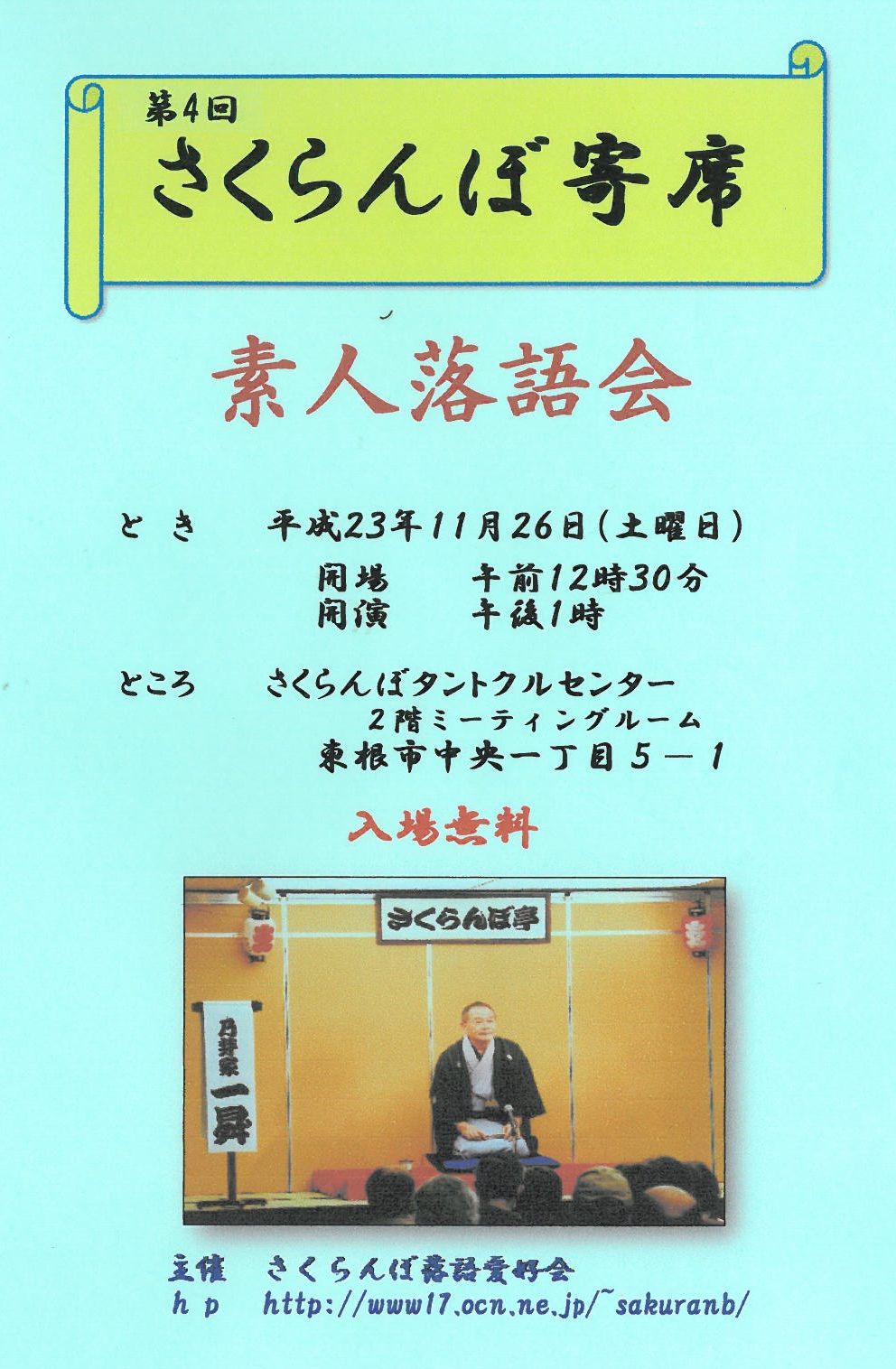 「第4回さくらんぼ寄席」のお知らせをいただきました 投稿日:2011年10月24日 作成者: 10月 24, 2011 さくらんぼ落語愛好会さんより、「第4回さくらんぼ寄席」のチラシをいただきましたので、掲載させていただきます。