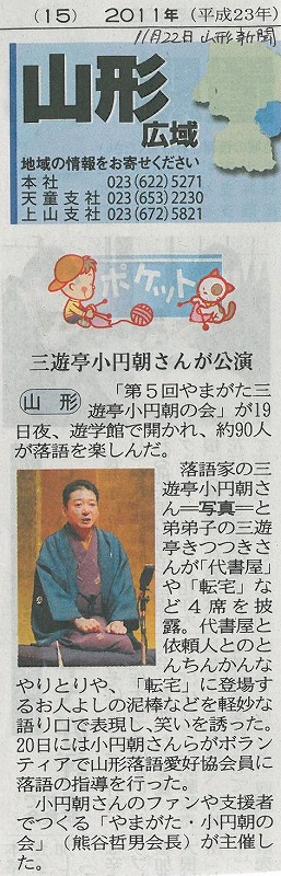 「山形新聞」に一部掲載されました 投稿日:2011年11月22日 作成者: yamagata-rakugo6月 9, 2016 先日、三遊亭小圓朝師匠から稽古をつけていただいたことが、22日の山形新聞に掲載されました。 もちろん、三遊亭小圓朝師匠の記事がメインですが、ほんの一部でも当会が掲載されて、大変光栄です。 【笑風亭佐と吉】