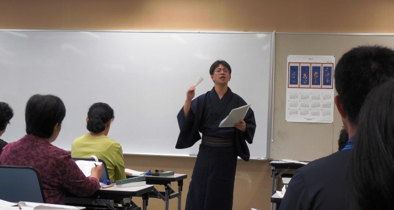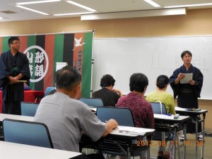 落語の稽古の基本は、なんと言っても「反復練習」。台本とCDを使った稽古方法や、簡単な所作(上下の割り付け)などを学んでいただきました。受講生のみなさんからは活発な質問が飛出し、こちらがびっくりするくらいに「やる気十分!」といった感じでございます(*^_^*)