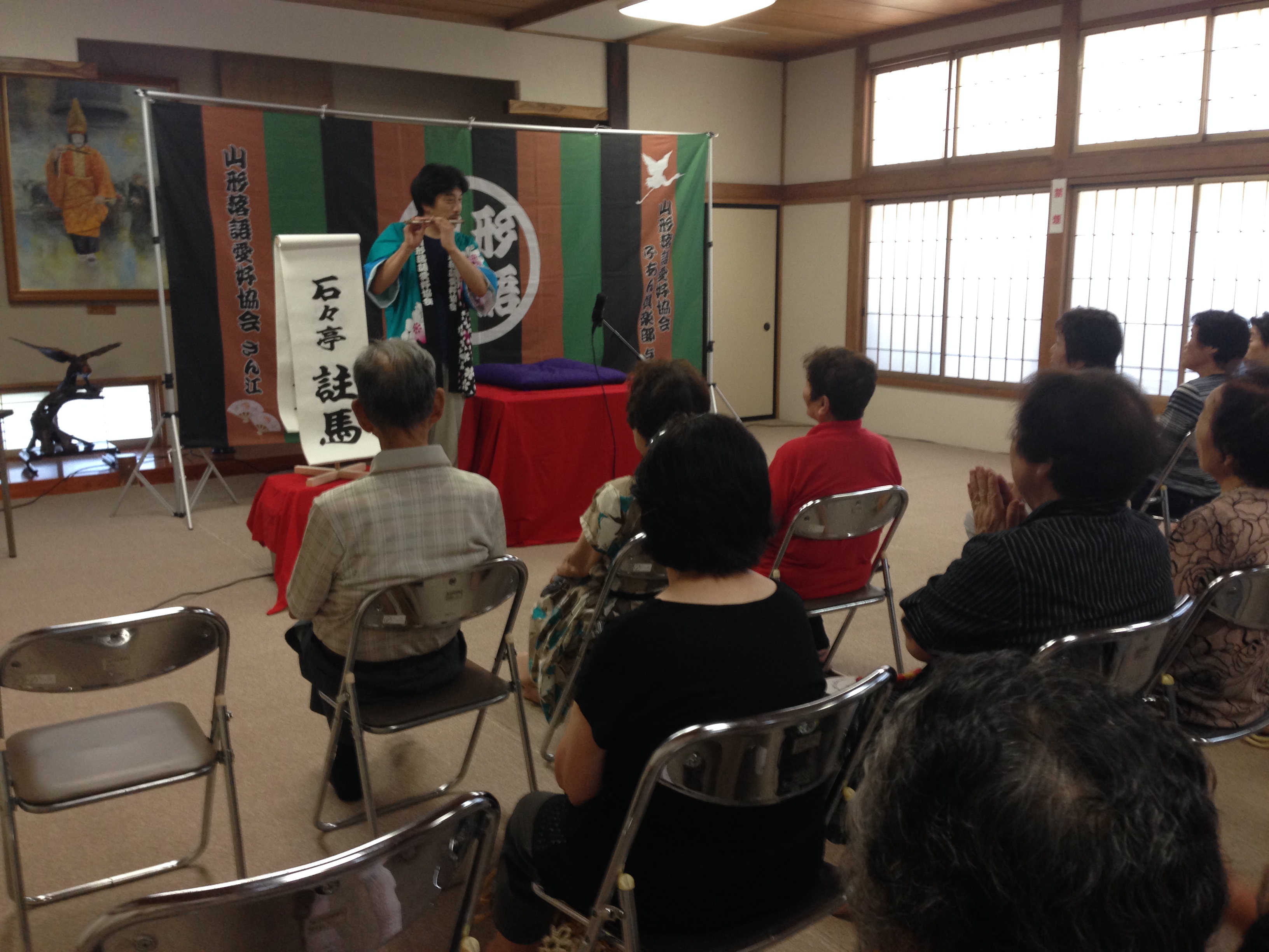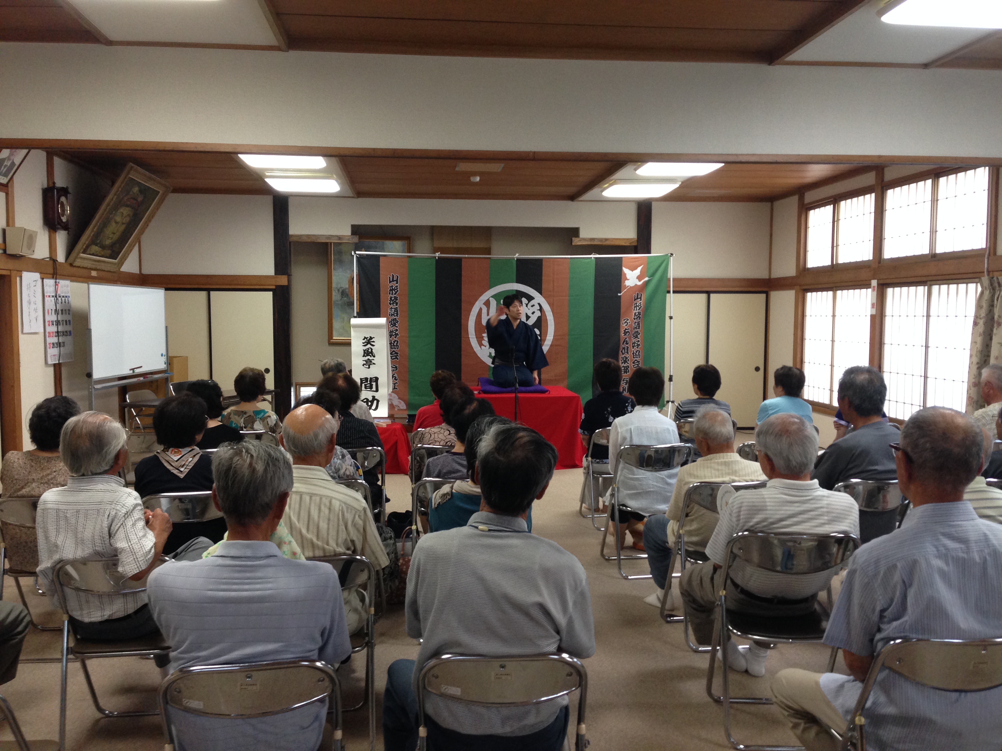 とかみふれあいセンターさんの落語会が終わった直後、山形市江俣二丁目にあります新江俣会館に移動いたしました。大変ありがたいことに、江俣新生会さんの落語会は三年連続の開催となります(*^_^*)午後からは全国的な猛暑でうだるような暑さとなりましたが、それを吹き飛ばす大爆笑の落語会になりましたよ(^^)/