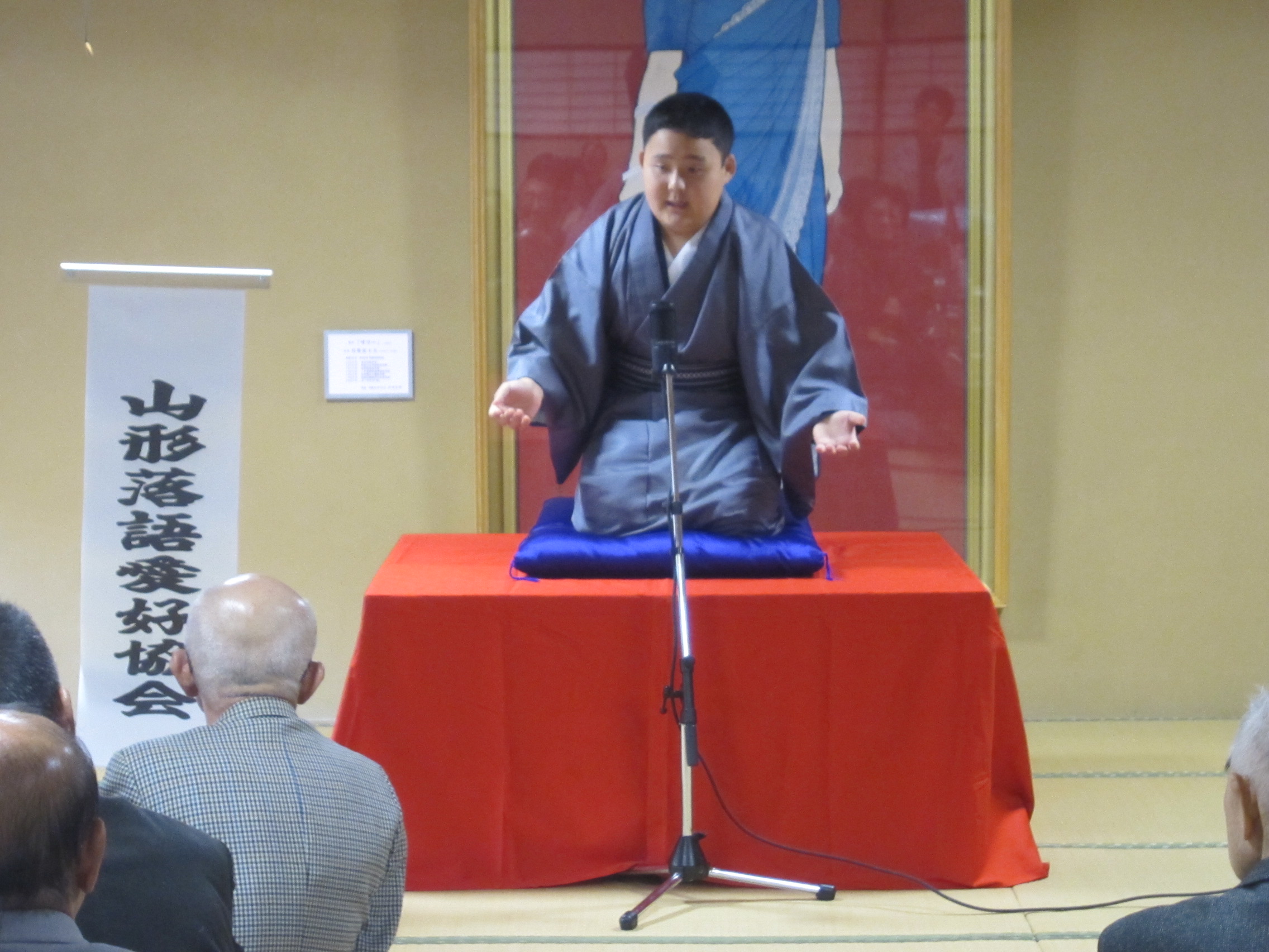 続いては、デビューしたてのほやほや丘割君の「親子酒」です。本人がデビューしたてであることを理由に、まだ間助代表から扇子をもらってないことや丘割君のめくりもない(※満月機材分)という自虐ネタを入れつつ、笑いを取っておりました。デビュー2回目とは思えないレベルでしたよ(^o^)本題では、酒飲みの所作や言葉遣い、表情など大人の酒飲み顔負けと言った感じでした。終演後は、本当に中学生?どこで酒飲仕草覚えたの?などと質問攻めにあうほどでございました。