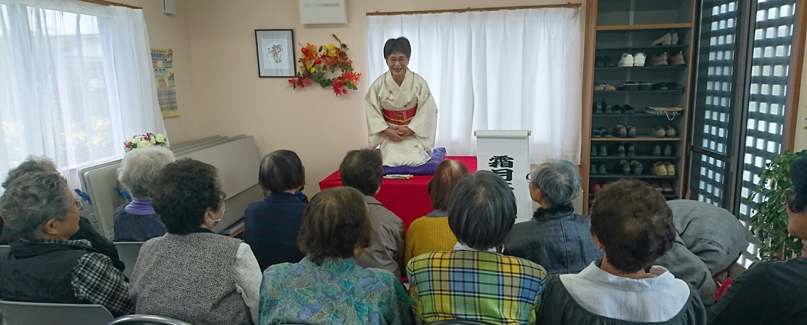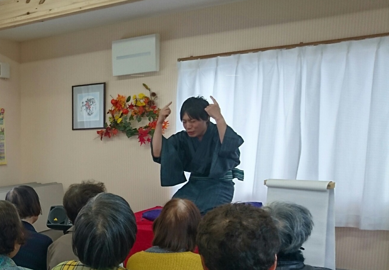 本日は山形市長町にあるオレンジカフェよつばさん(認知症カフェ)にて、初の落語会を開催して頂きました。認知症カフェは、厚生労働省が認知症施策推進総合戦略で普及を進めている、患者さんやその家族・地域の方が交流できる拠点となっており、よつばさんは7月にオープンしたばかりのとても新しくて綺麗な建物です。本日も地域の皆様で満員御礼でございました。25名のとても明るいお客様に囲まれて、こよしさんとわたくし恋之介が高座をつとめてまいりましたよ(^^)