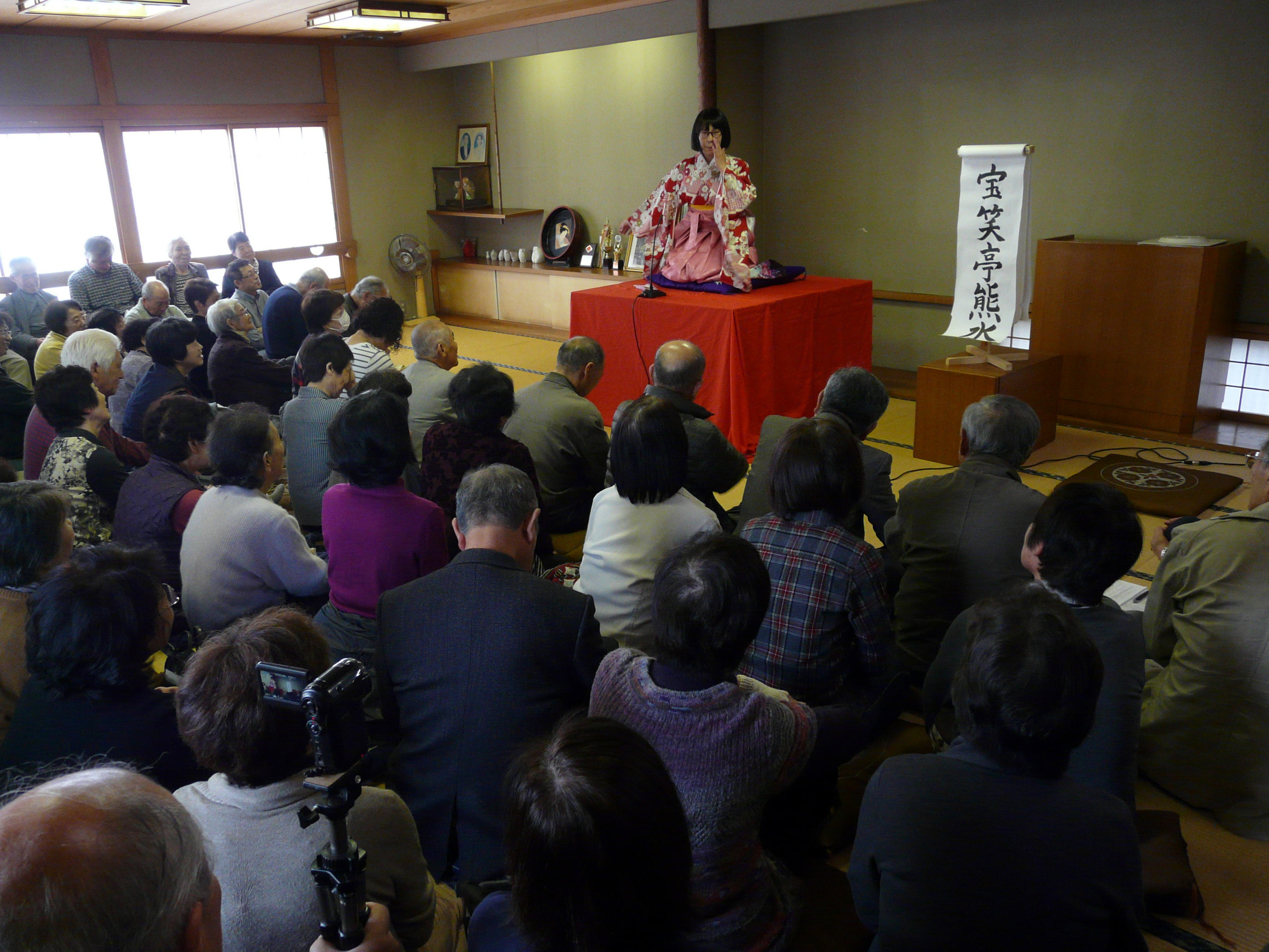 本日、11月5日(日)は、山形市は大野目集会所にて町内連合会「高齢者の集い」いきいきサロン落語会が開催されました。年に一度の催しだそうです。宝笑亭一門?姉妹?親子?のご指名ということで大野目テーブルさんご案なーい!という状況の中、私、天空亭魚々太郎が、花束に添える一輪のドクダミの如く、付録としてのこのことお邪魔してきたのでした。70名以上のお客様方が会場に一杯で、熱気ムンムン、笑いは一層ムンムンでございましたヨ(^o^)