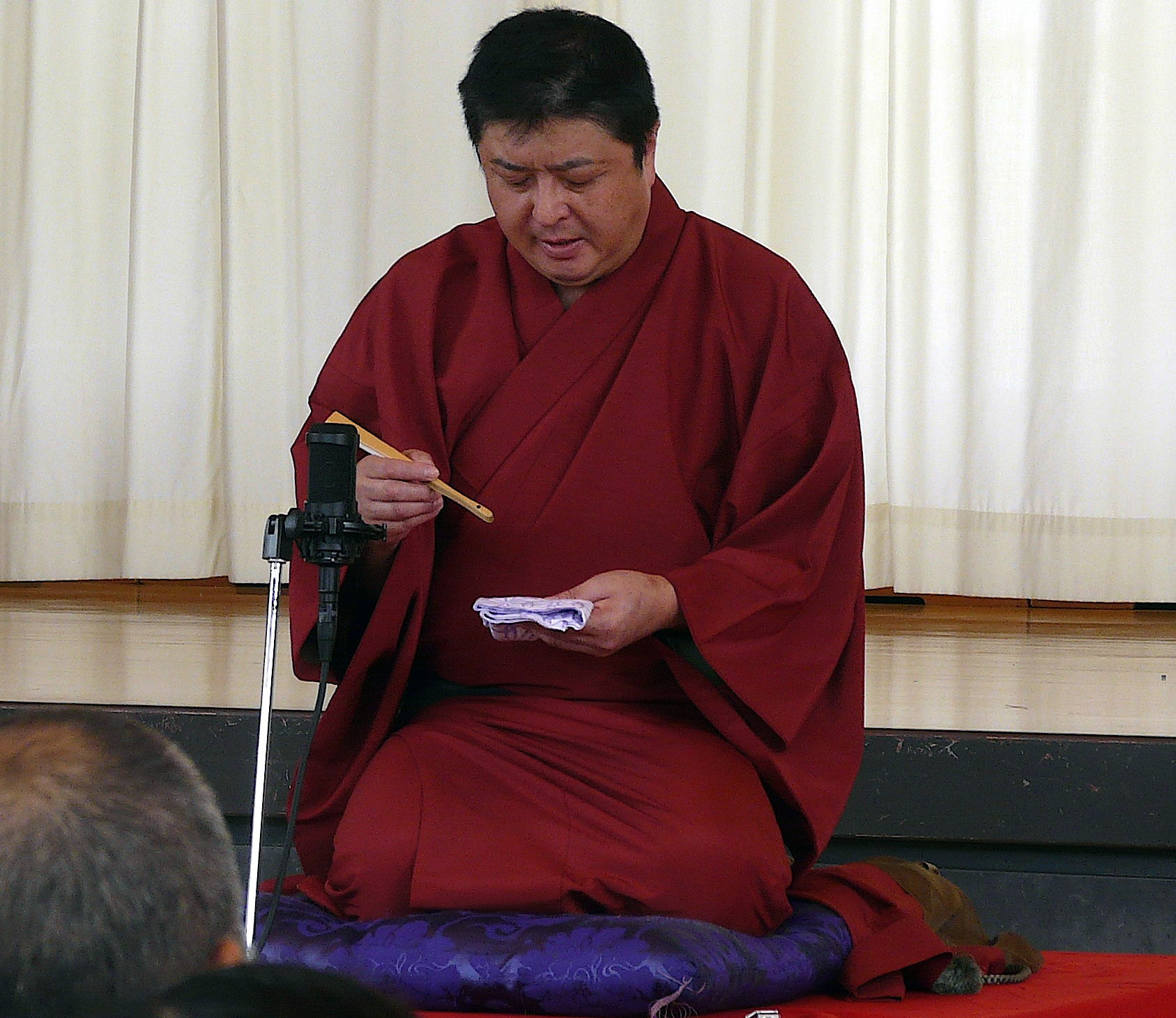 次は、恋之介さんが、教科書バージョンというか三遊亭圓窓バージョン(同じ演目でも噺家さんによってまるで異なる)の「ぞろぞろ」をお手本として披露しました。その後は、4名の生徒の皆さんが高座に上がり、4つのパートに分けて「ぞろぞろ」の発表会です。羽織を貸して羽織ってもらいました。まだまだ、教科書を見ながらの発表でしたが、なかなかいい線をいっています。学習発表会が楽しみという感じでした。