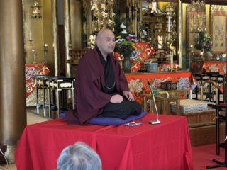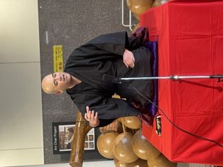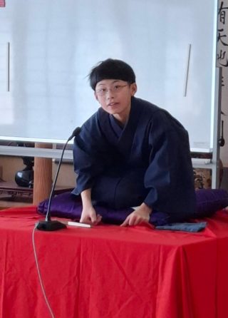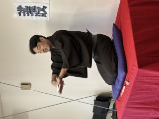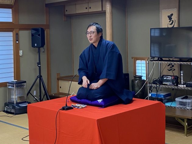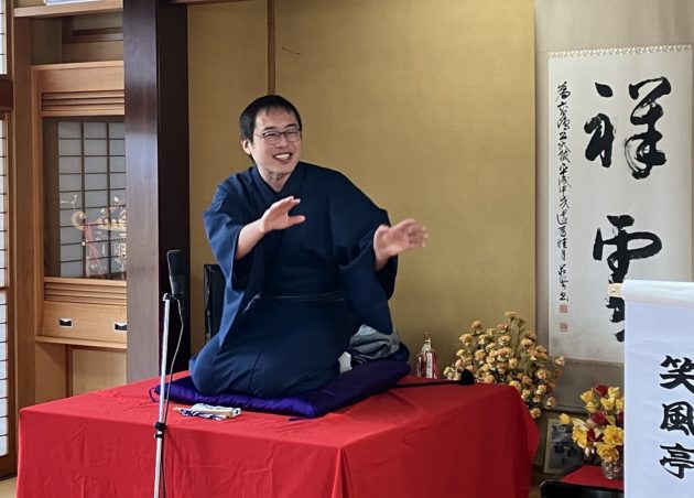 前座は私、千早が担当いたしました!マイクチェックの際にヘラヘラと身の上話を申し上げていたので、心なしかお客様の緊張感がほぐれていたような気がします。お席はご準備いただいていたのですが、何と言っても会場は通路。人の往来が激しいのがいつもの落語会と異なる点です。少しでも声を張るネタで、行き交う人々のお足を止めてみせましょう。そんな思いで、講談風に「荒茶」を申し上げました。結果、サゲ直前の絶対噛んだらダメなセリフを噛みましたが、本当にアットホームなお客様の雰囲気に赦され、お後と交代です。