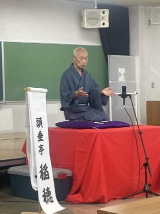 開口一番、私稲穂が「寿限無」でご機嫌伺いです。お客様は開演前に早口言葉で訓練をされておりましたので、丁度良い演目かと思い、私も気持ち良く演ずる事が出来ました。噺の内容に相槌を打ってくれたり、手を叩いてくれたりで楽しんで頂けたかなぁと思っております。