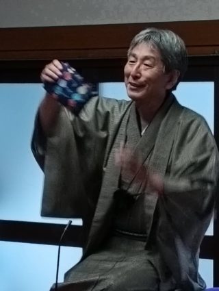 お次は私、笑門亭福来助です。落語会の後は交流会が控えているということで、短めのネタ「つる」でご機嫌お伺いです。季節ネタで笑っていただいた後、「厩火事」とは真逆の、ご隠居と八つぁんの登場する馬鹿々々しい噺に突入です。会場のあちらこちらから笑いを頂戴し、日頃大変なお仕事をされている皆さんの少しでもお役に立てたなら良かったのですが、さて落語の“間の取り方”について参考になったかは、はなはだ疑問です。