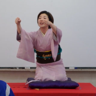 まずは、落語の始まりと英語落語の始まりについて簡単に説明してから、落語を見たことのない生徒さんがほとんどだったので、日本語の小噺「美術館」で、落語の楽しみ方を練習しました。初めて落語を見るとは思えないほど、みなさん笑いどころをしっかりつかんでいて、最初から爆笑をいただくことができました。準備が整ったところで、いよいよバイリンガル落語です!